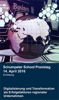Für Unternehmen gehört die Digitalisierung ihrer Prozessabläufe und der Kommunikation zu den größten Herausforderungen der Gegenwart. Diese Thematik steht daher im Mittelpunkt des Schumpeter School Praxistages 2016.