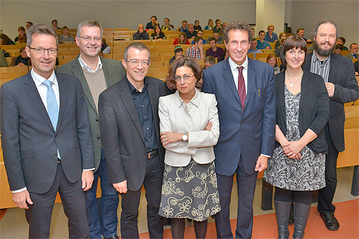 Ringvorlesgung „Fachprofil und Bildungsanspruch“ auf dem Campus Grifflenberg (v.l.n.r.): Uni-Rektor Prof. Dr. Lambert T. Koch, Prof. Dr. Gerald Hartung, Prof. Dr. Jochen Krautz, Prof. Dr. Rita Casale, Prof. Dr. Julian Nida-Rümelin, Dr. Michaela Heer, Geschäftsführerin des Servicebereichs der School of Education, und Prof. Dr. Ulrich Heinen, Vorsitzender des Gemeinsames Studienausschusses (GSA) der School of Education. <br /><span class="sub_caption"> Fotos Michael Mutzberg</span>