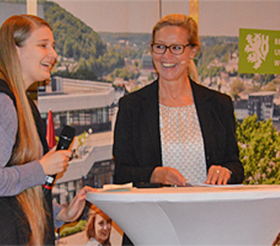 AStA-Vorsitzende Konstanze Wagner (hier im Interview mit Dr. Christine Hummel) informierte ihre neuen Kommilitoninnen und Kommilitonen über Veranstaltungen des Allgemeinen Studierendenausschusses (AStA) und des Studierendenparlaments (STUPA).
